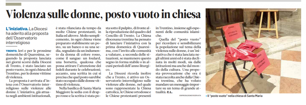Molte le adesioni nelle parrocchie trentine a partire da domenica 1° marzo all’iniziativa quaresimale “Un posto vuoto, in ogni chiesa del Trentino, per le donne vittime di violenza, proposta della Diocesi d’intesa con l’Osservatorio interreligioso sulle violenze alle donne.