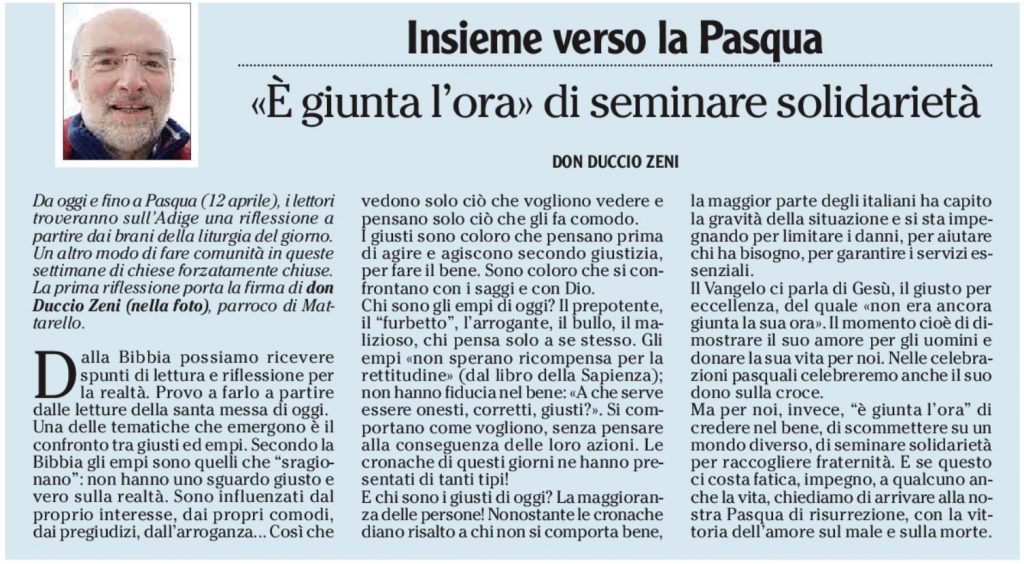 Ma per noi, invece, “è giunta l’ora” di credere nel bene, di scommettere su un mondo diverso, di seminare solidarietà per raccogliere fraternità. E se questo ci costa fatica, impegno, a qualcuno anche la vita, chiediamo di arrivare alla nostra Pasqua di risurrezione, con la vittoria dell’amore sul male e sulla morte.