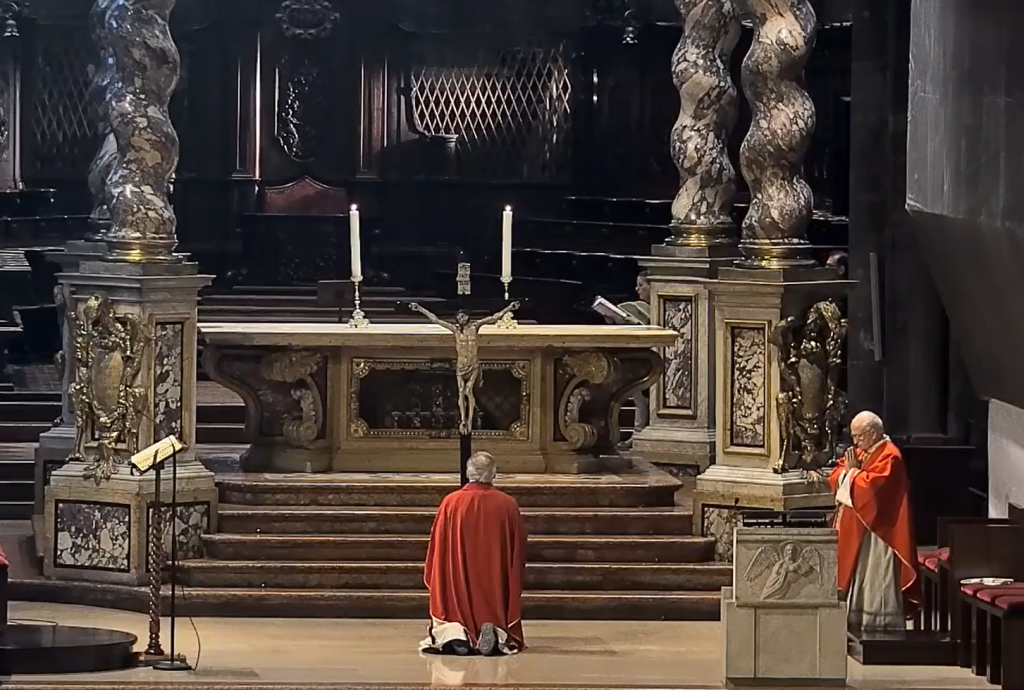 “L’Uomo della croce tocca il cuore di uomini, abituati a frequentare la morte, e li manda in crisi”. Nella cattedrale di Trento, già spoglia per il Venerdì Santo e svuotata dei fedeli dall’emergenza Coronavirus, l’arcivescovo Lauro Tisi guida (in diretta Tv e streaming) la celebrazione della Passione e Morte del Signore, con il racconto evangelico delle ultime ore di Gesù, l’intensa preghiera universale (con il ricordo di tutte le persone a vario titolo toccate dalla pandemia) e l’adorazione della croce. In cattedrale anche l’arcivescovo emerito Luigi Bressan, accanto al decano del Capitolo, monsignor Lodovico Maule e al parroco del Duomo, don Andrea Decarli.