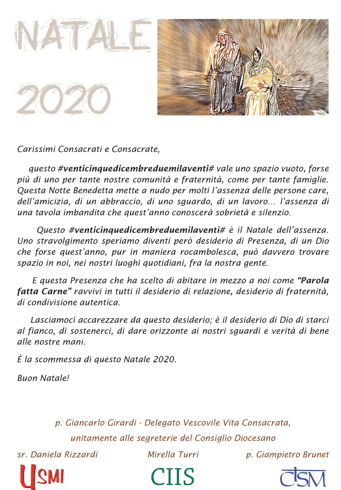 Buon Natale 2020 access_timePubblicato il: 19 Dicembre 2020 Lettera di auguri a tutti i religiosi e religiose Arcidiocesi di Trento - Buon Natale Un augurio di Buon Natale da parte del Delegato Vescovile Vita Consacrata e dei membri del Consiglio Diocesano CISM USMI CIIS – Arcidiocesi di Trento. Lettera auguri Natale 2020 Sereno Natale e Buon Nuovo Anno!